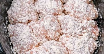 Dredge chicken in flour, add to slow cooker. 4 simple ingredients later: terrific dinner!
